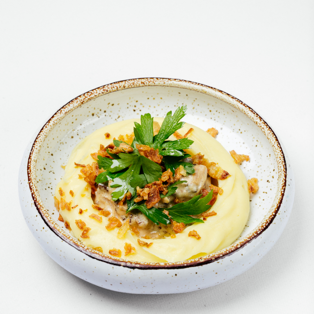 Говяжья вырезка, лук репчатый, сливки, куриный бульон, масло подсолнечное, перец чёрный молотый, соль, картофельное пюре, молоко, масло сливочное.