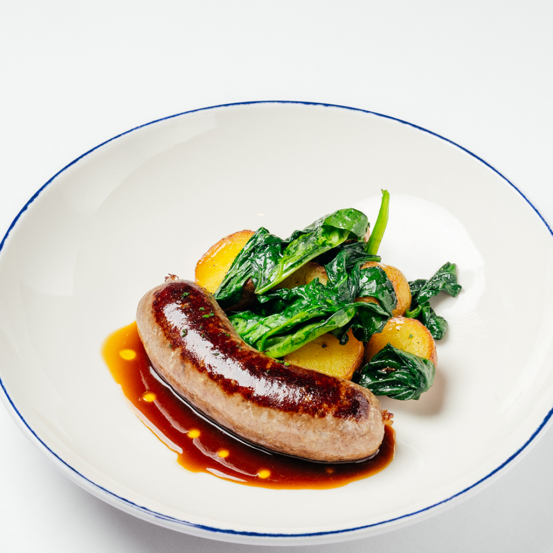 Соус демиглас, колбаска говяжья, картофель-мини, шпинат.