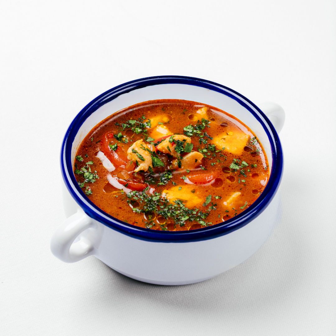 Лук репчатый, чеснок, перец чили, томатная паста, рыбные специи, соль, сахар, вода, помидоры черри, фасоль белая консервированная, форель, петрушка рубленая.